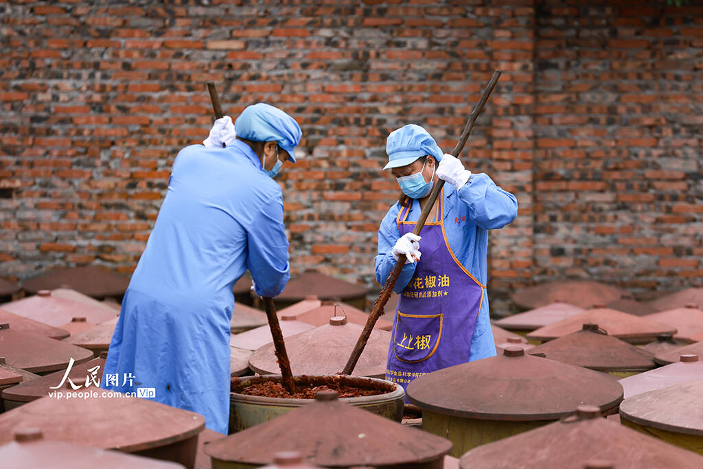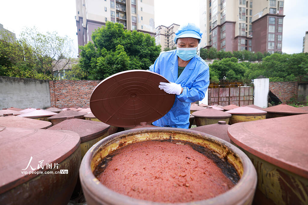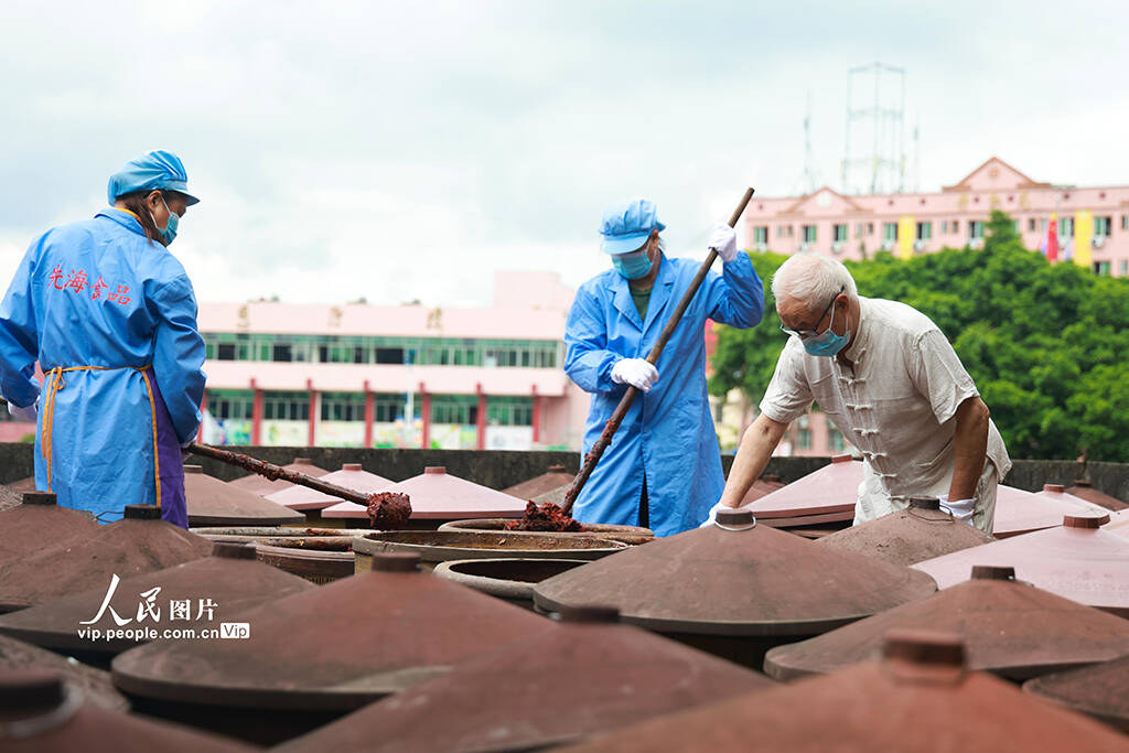 7月1日,四川遂宁安居区蟠龙酿造厂晒场,工人们正在以古法手工酿造豆瓣酱,酱香浓郁。(张勤宝)