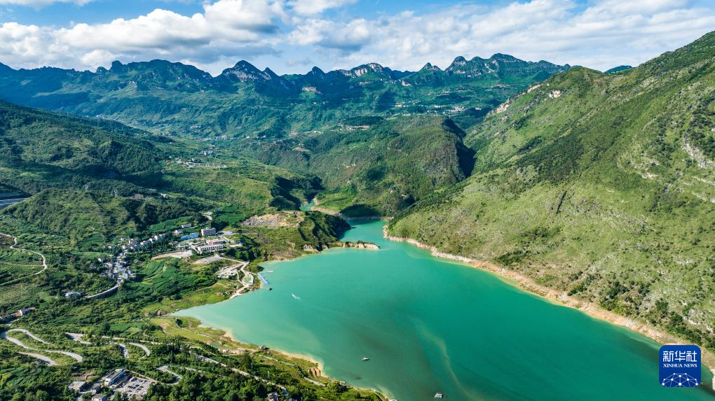 夏日时节,贵州省六盘水市六枝特区牂牁江风景名胜区草木苍翠、江水碧蓝,青山绿水与道路村庄组成一幅幅美丽画卷。(陶亮)