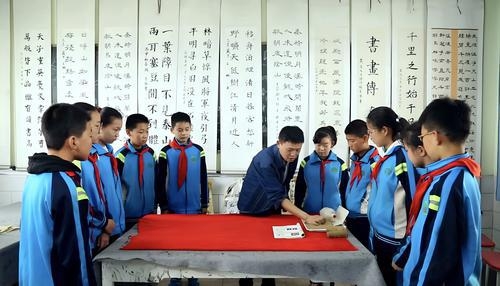 如今,张永华不仅在沙书创作上取得了卓越成就,还将传承沙书艺术视为自己的使命与责任。他编印了《沙书基础教材》,精心设计教学内容和课程体系,将自己多年的创作经验和技巧毫无保留地传授给学生。在学校开展沙书教学时,他耐心地指导每一位学生,从最基础的握沙姿势、运沙手法教起,到引导学生体会书法的韵味与沙书的独特魅力。“每次看到孩子们在沙台上兴奋地画出第一个字,我就觉得这些付出都值得。”张永华笑着说,“这门技艺得让年轻一代接着传下去。”通过他的努力,越来越多的学生了解并喜爱上了沙书,也在他们心中播下了传统文化的种子。