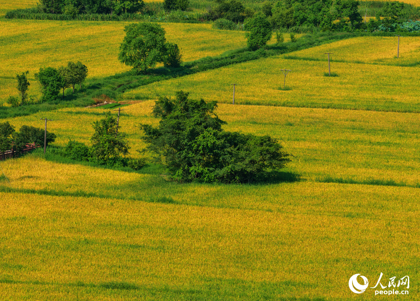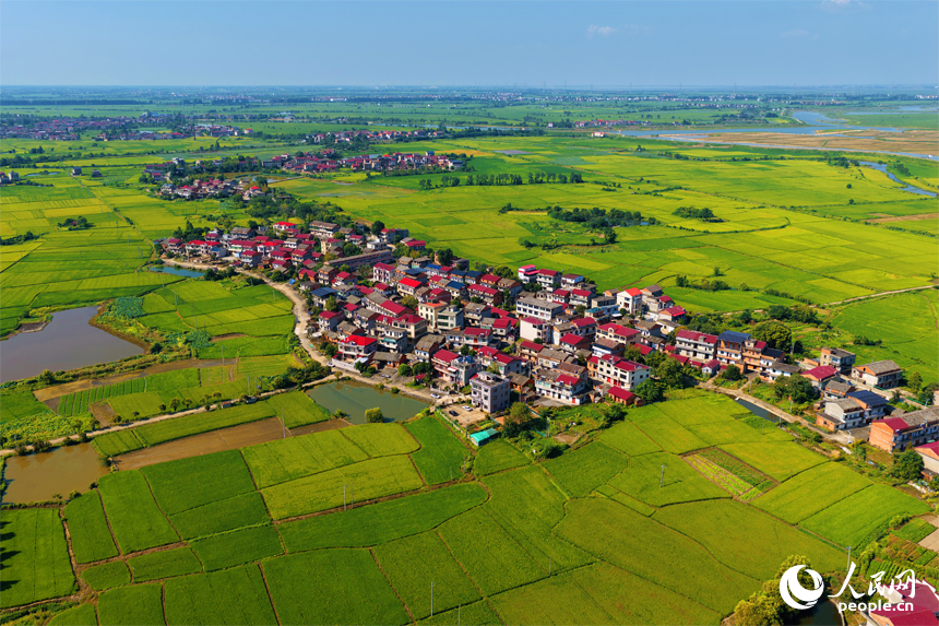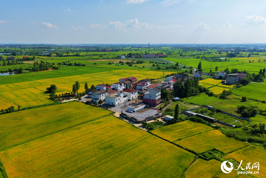 江西省南昌市南昌县幽兰镇,早稻逐渐转黄,与道路、河流及村居构成一幅美丽的夏日田园画卷。