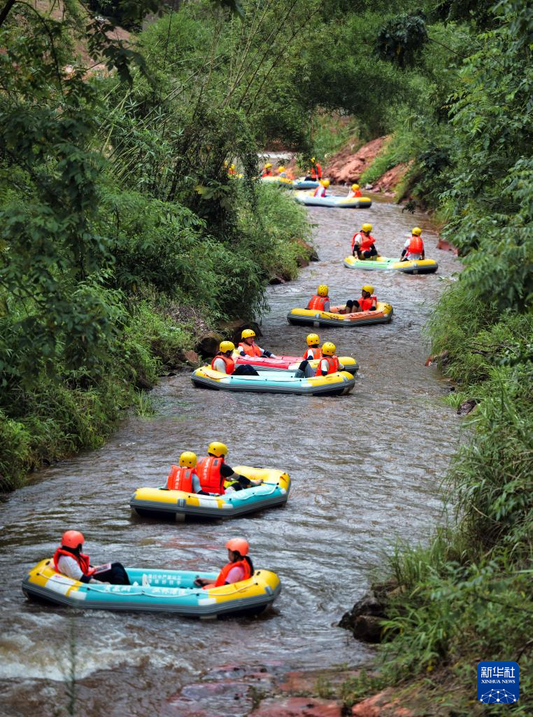 7月5日,四川省泸州市纳溪区黄龙湖景区,游客在丛林河流上漂流。(刘学懿)