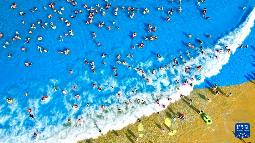 7月5日,浙江省湖州市长兴县太湖图影旅游度假区龙之梦乐园嬉水世界,游客亲水消暑(无人机照片)。(吴拯)