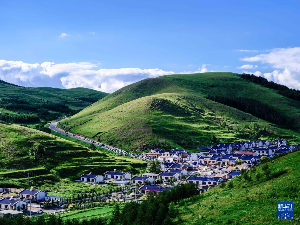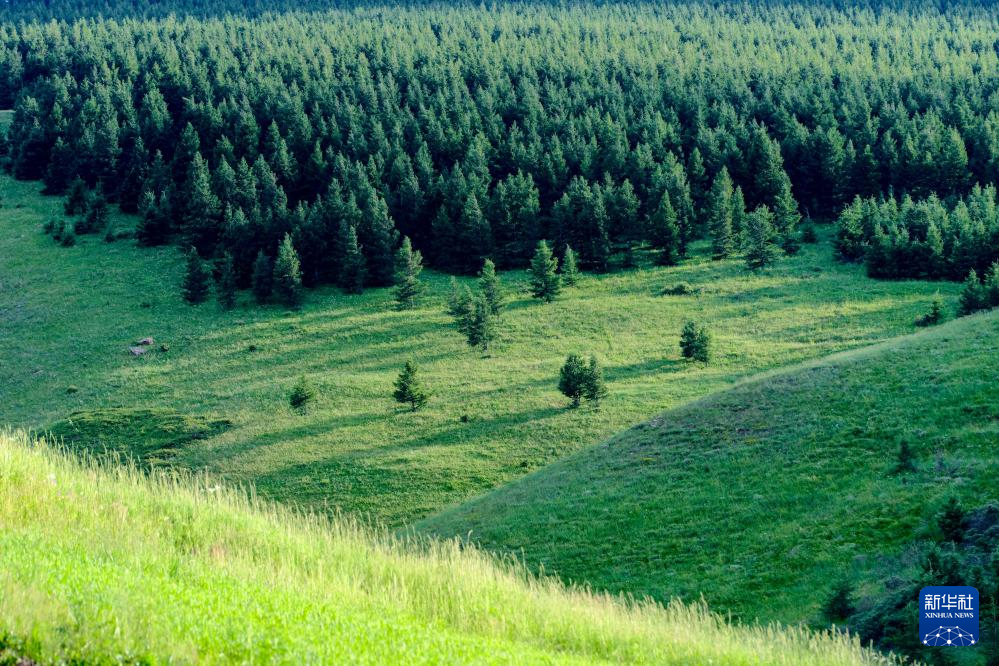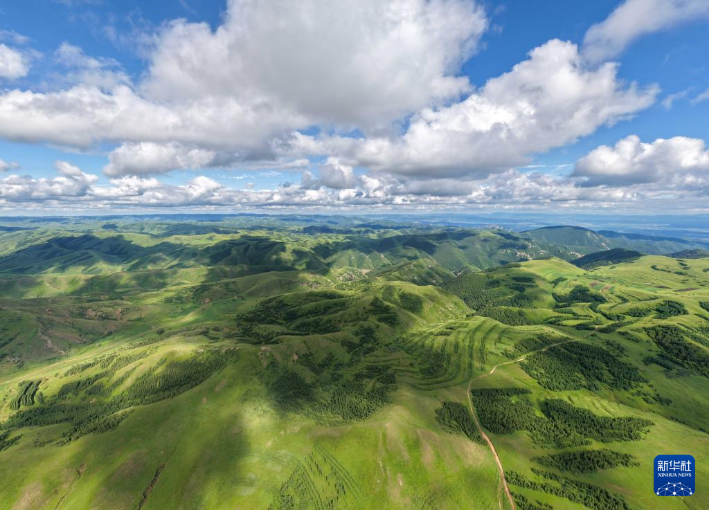 盛夏时节,位于内蒙古呼和浩特市新城区黄花窝铺村的敕勒川高山草原绿意盎然,风景如画。(马金瑞)