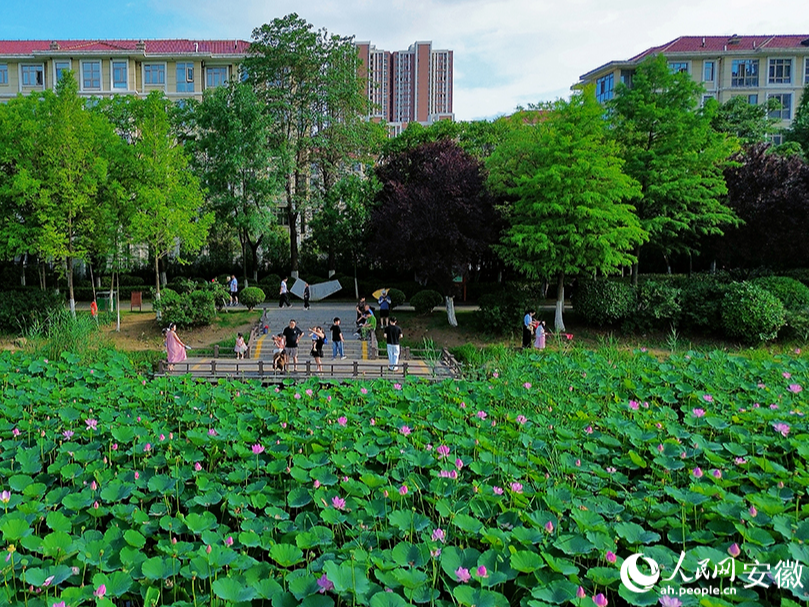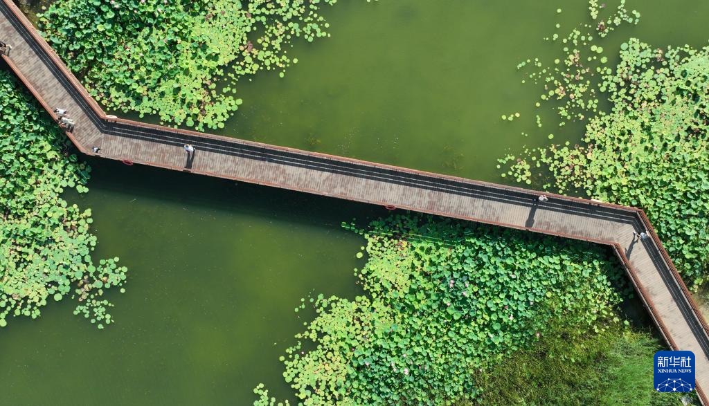 7月5日,游人在河北省石家庄市滹沱河畔赏荷游玩(无人机照片)。(梁子栋)