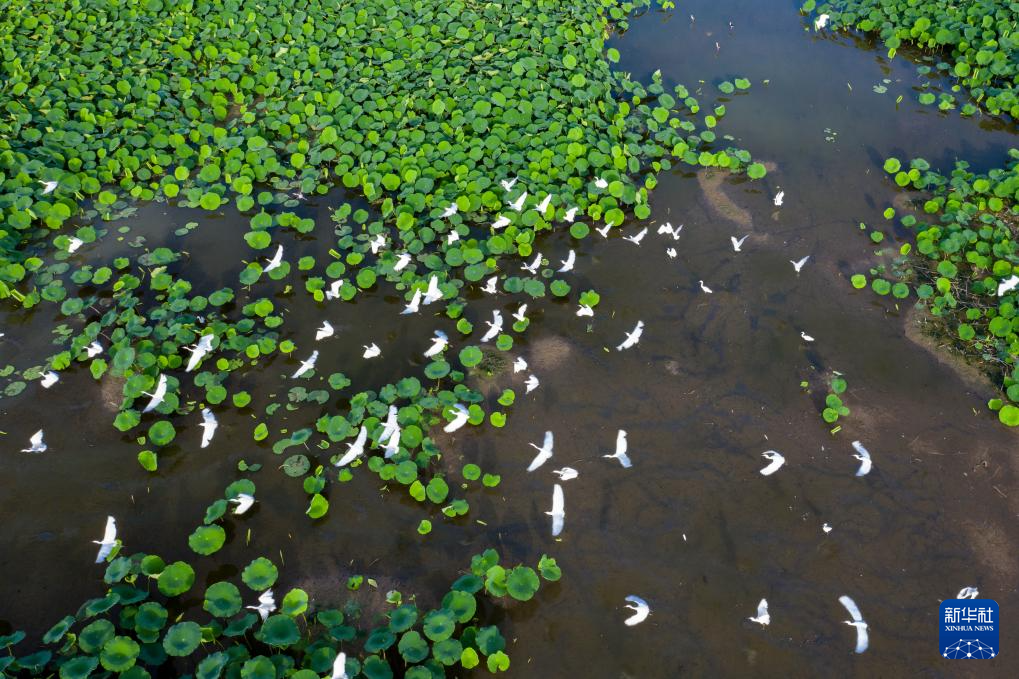 7月5日,白鹭在山东省淄博市高青县常家镇一处荷塘飞舞(无人机照片)。(张维堂)
