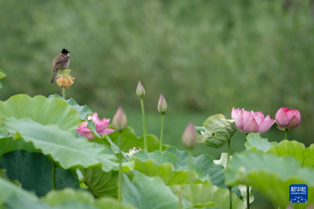 7月5日,在云南省大理白族自治州洱源县草海湿地,一只小鸟在荷塘驻足。(罗新才)