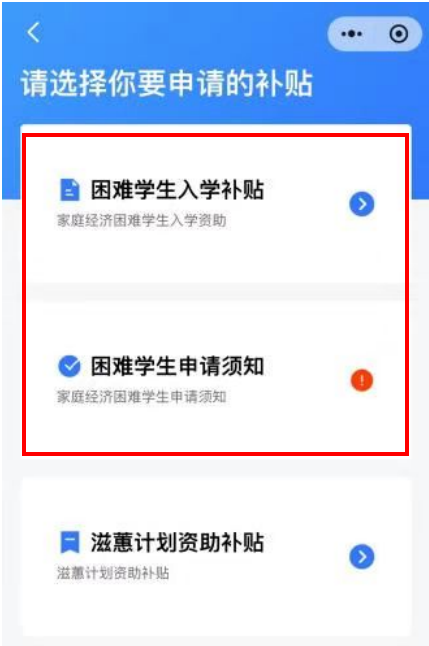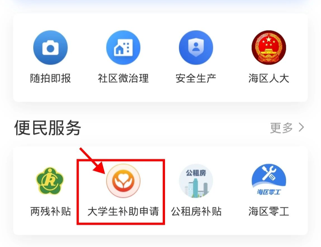 1. 线上登录 “海区 e 家” 小程序,依次选择【大学生补助申请】→【困难学生入学补贴】模块,按系统提示完成所需材料的拍照上传即可。
