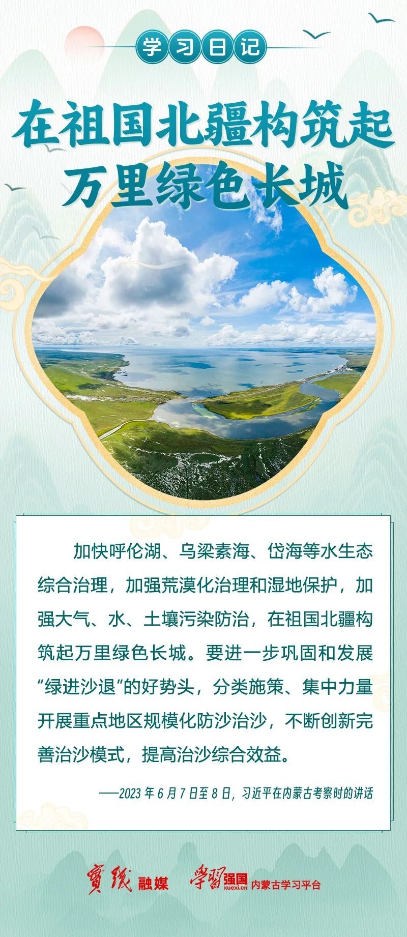 党的十八大以来,习近平总书记站在中华民族永续发展的战略高度,就加强荒漠化综合防治、打好“三北”工程攻坚战等事关生态文明建设的重大命题,作出了一系列深邃思考与战略擘画。据此,“学习强国”内蒙古学习平台策划推出总书记金句特辑,引导广大干部群众深入学习领会习近平总书记重要讲话精神,为筑牢我国北方重要生态安全屏障而持续奋斗,不断积蓄和增厚祖国的“绿色家底”!
