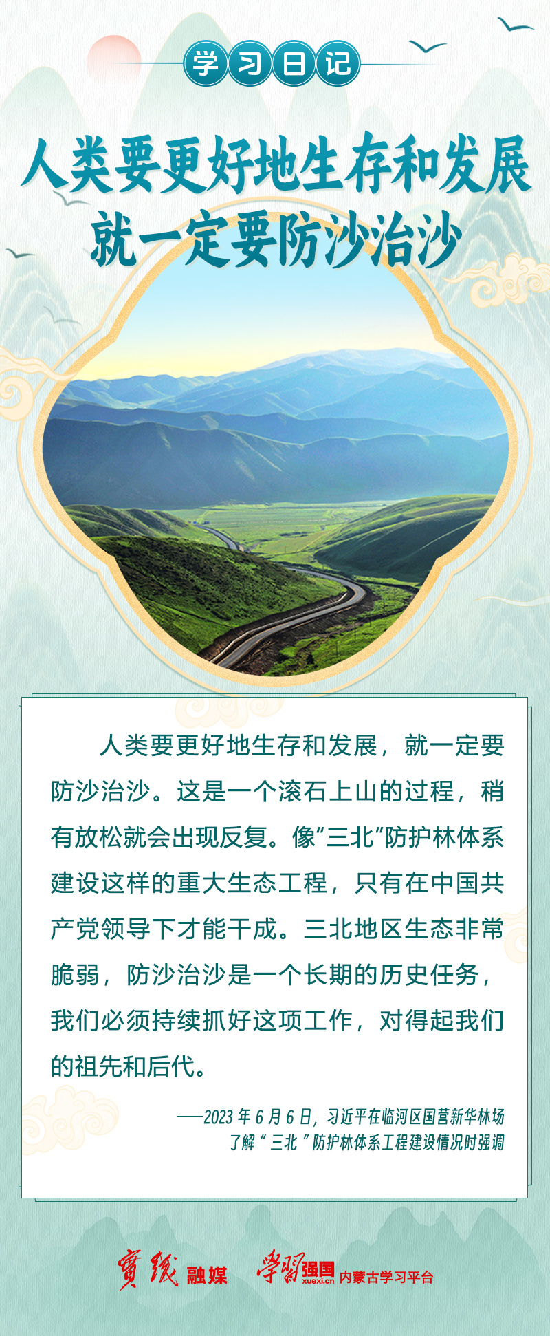 党的十八大以来,习近平总书记站在中华民族永续发展的战略高度,就加强荒漠化综合防治、打好“三北”工程攻坚战等事关生态文明建设的重大命题,作出了一系列深邃思考与战略擘画。据此,“学习强国”内蒙古学习平台策划推出总书记金句特辑,引导广大干部群众深入学习领会习近平总书记重要讲话精神,为筑牢我国北方重要生态安全屏障而持续奋斗,不断积蓄和增厚祖国的“绿色家底”!