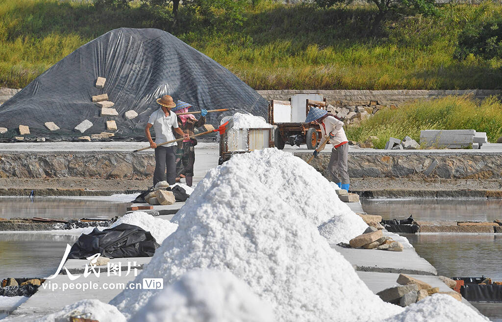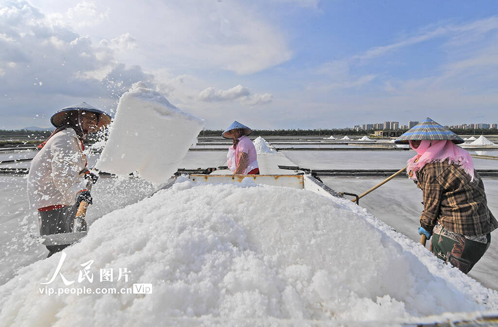 7月8日,福建省泉州市泉港区山腰盐场,盐工们正在盐田装运原盐,开展归垛作业。(林弘梫)