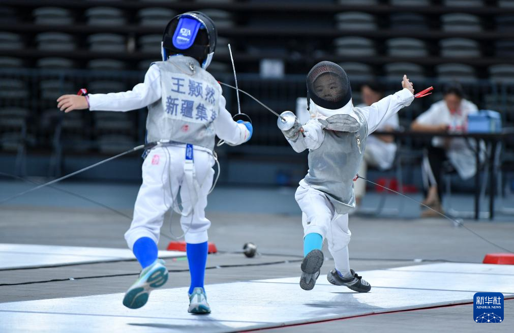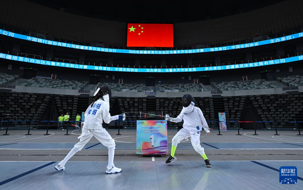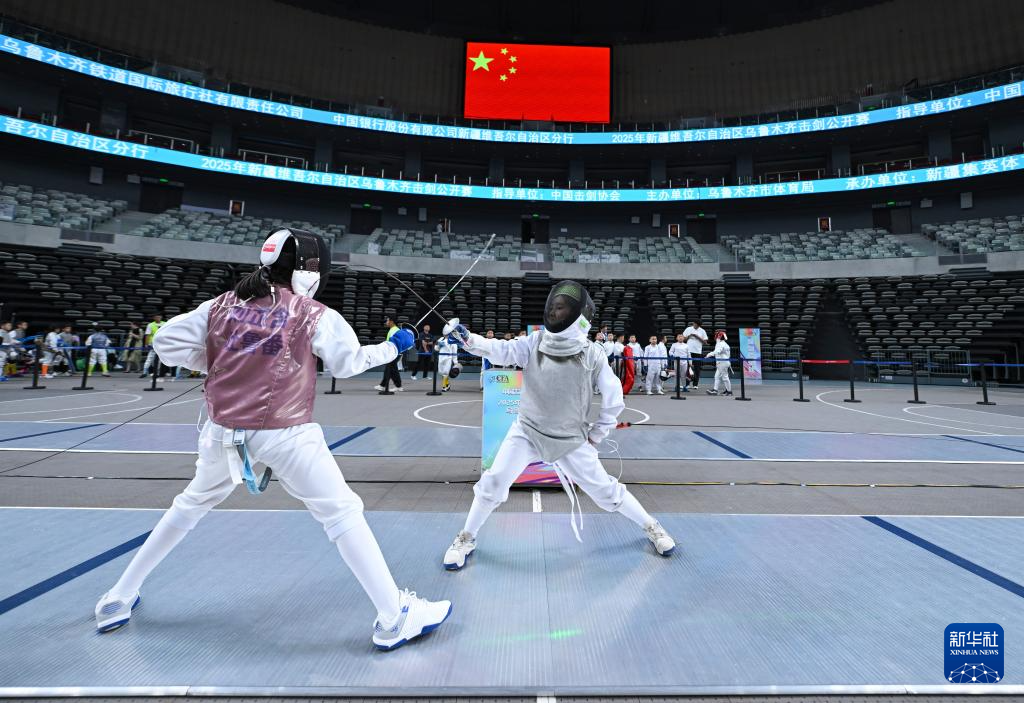 7月12日,中国击剑协会D级认证赛“2025年新疆维吾尔自治区乌鲁木齐击剑公开赛”在乌鲁木齐奥体中心体育馆开赛。本次赛事为期两天,设置了U6至年龄开放组多个组别的个人赛及团体赛,吸引了全国各地300多名选手参赛。(胡虎虎)
