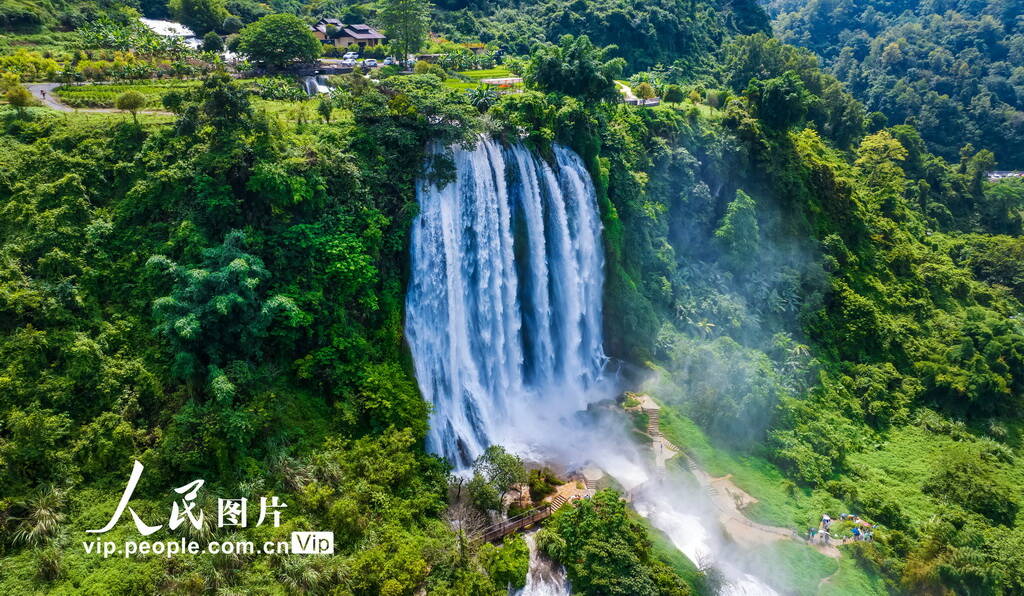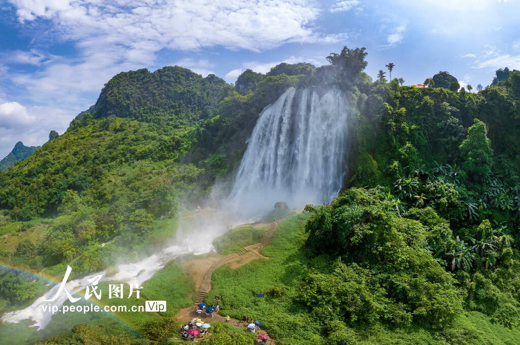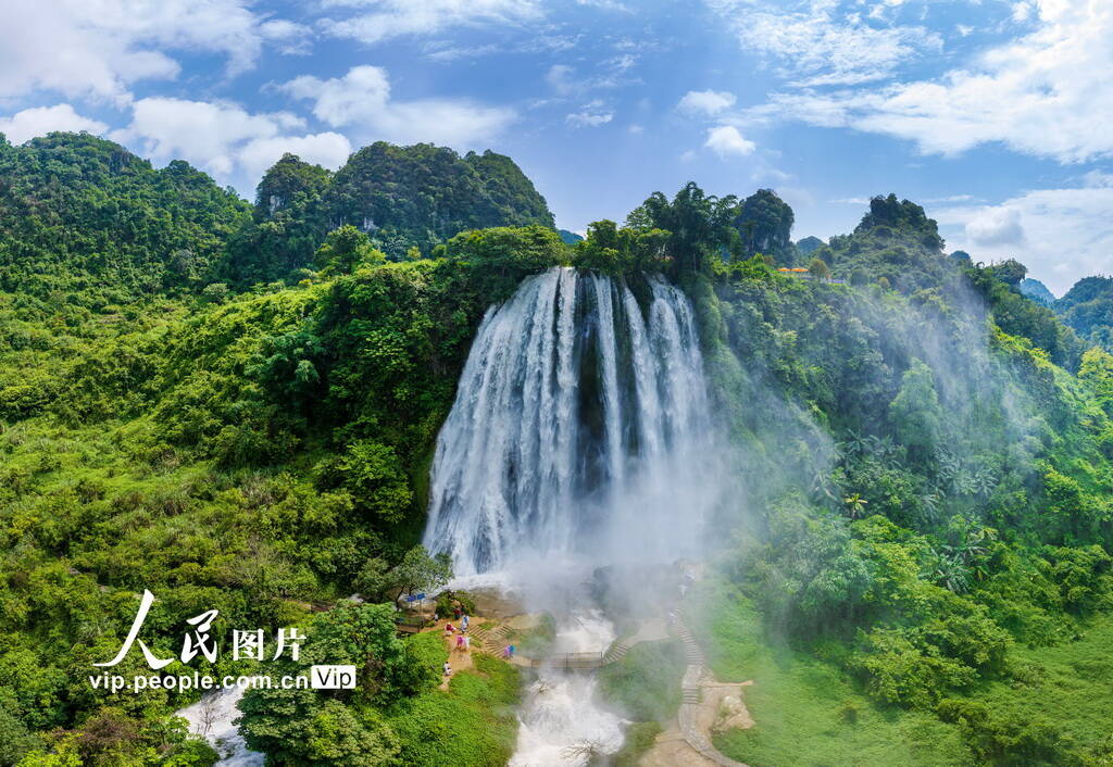 近日,广西靖西市三叠岭瀑布进入丰水期,流瀑从山顶悬崖处倾泻而下,气势磅礴,吸引了许多游客前来观赏。