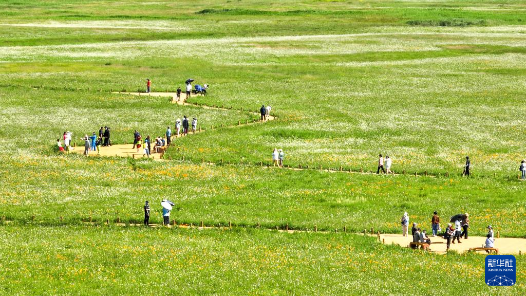 盛夏时节,内蒙古锡林郭勒盟正蓝旗金莲川草原迎来最佳观赏期,金黄色的花海与苍茫草原相映成趣,世界文化遗产元上都遗址的断壁残垣在草原上清晰可见。游人流连花丛中或驻足遗址前,感受自然野趣与历史文化。(贝赫)