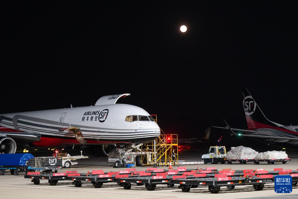 子夜时分,鄂州花湖国际机场灯火通明,几十余架货机整齐排列在停机坪上,上百名工作人员正加紧卸货。当晚,共有来自国内外的近4000吨货物在这里集结中转,再运送到全国和世界各地。(肖艺九)