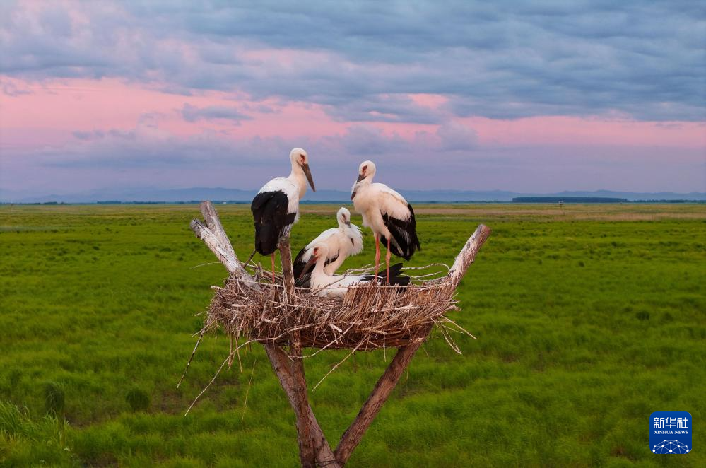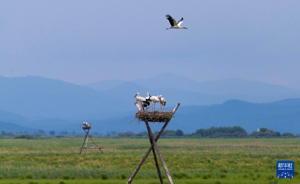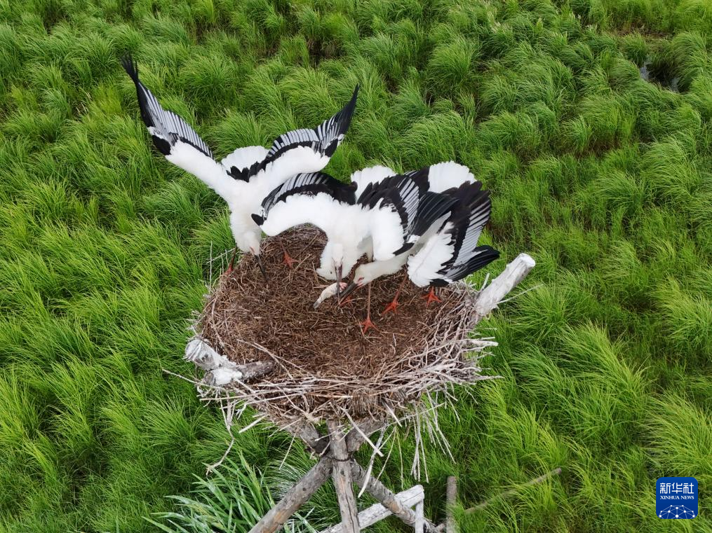 盛夏时节,在位于黑龙江省富锦市的黑龙江三环泡国家级自然保护区,人工巢内的东方白鹳雏鸟羽翼渐丰,即将离巢。据保护区管理局介绍,保护区在落马湖管护站搭建的20个人工巢今年全部“入住”东方白鹳,共孵育雏鸟70余只。(曲玉宝)