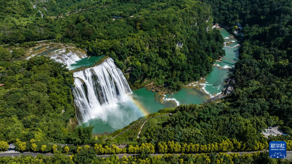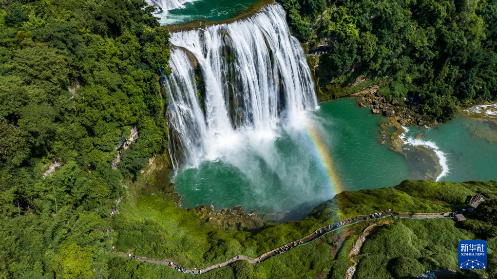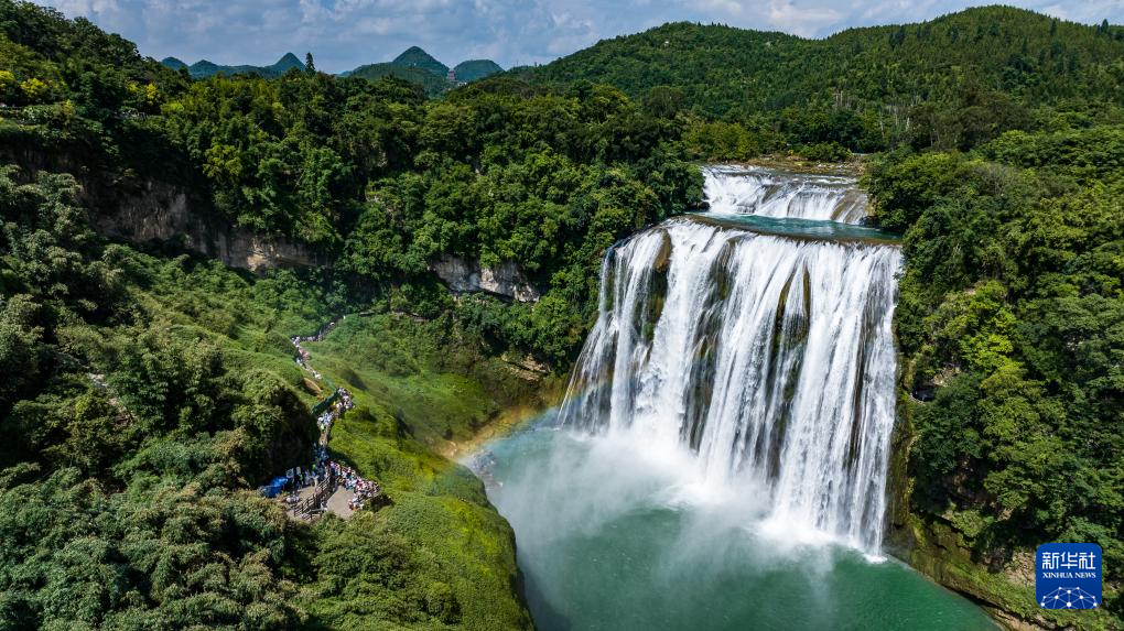 近日,位于贵州省安顺市的黄果树瀑布景区正处于夏日最佳观赏期。黄果树大瀑布水势磅礴,在阳光的照射下,瀑布前架起一道彩虹,美丽的景象吸引各地游客前来观赏游玩。(陶亮)