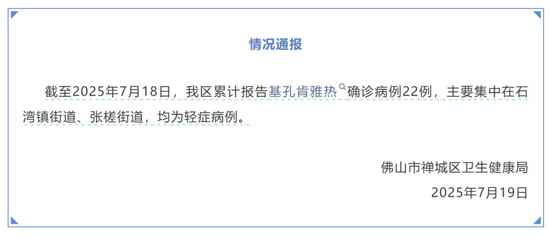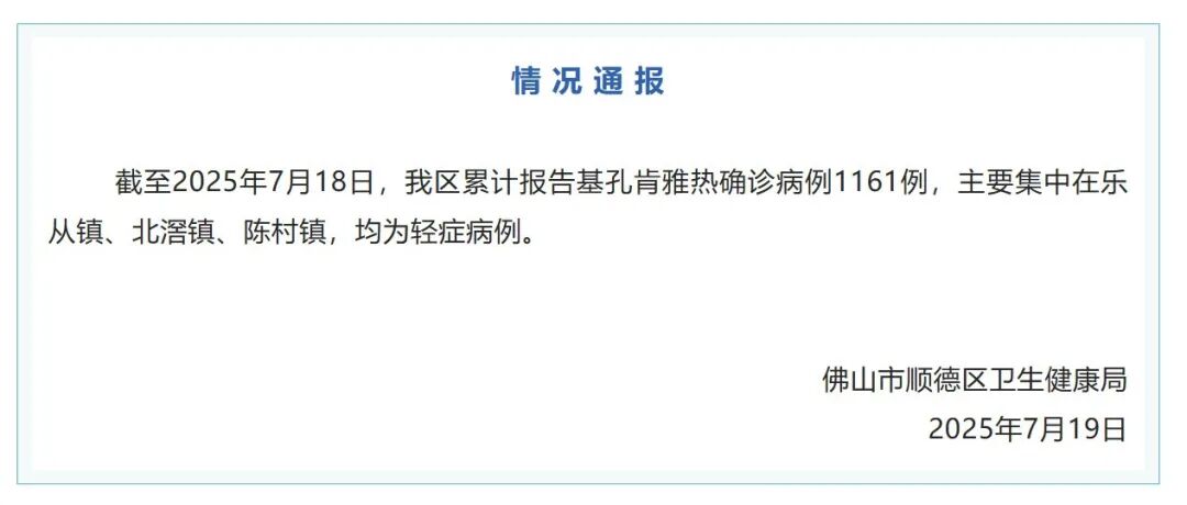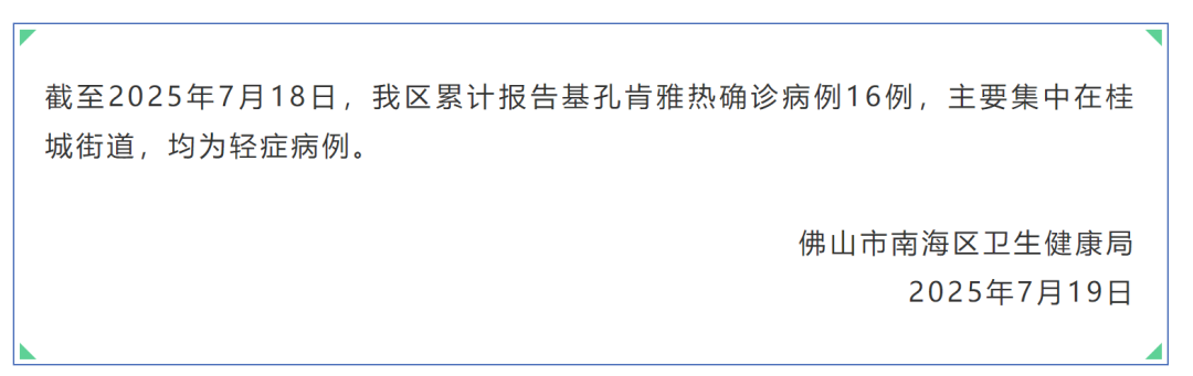 三地已出现基孔肯雅热疫情 防蚊灭蚊是防控蚊媒传染病最经济、最有效的根本措施。三地号召区内各企事业单位、学校、建筑工地、村(社区)、家庭及全体市民,7月19日至20日(本周末)集中开展以清除蚊虫孳生地和杀灭成蚊为重点的爱国卫生运动。请广大市民朋友们积极行动,充分利用周末时间,及时清除蚊虫孳生地,杀灭成蚊。 据此前报道,7月15日下午,广东佛山市顺德区卫生健康局通报称,7月8日,顺德区监测发现一起境外输入引起的基孔肯雅热本地疫情。 基孔肯雅热是由基孔肯雅病毒引起的一种急性传染病,和登革热一样,也是通过埃及伊蚊和白纹伊蚊叮咬传播。 潜伏期1至12天,通常3至7天。 感染基孔肯雅热的患者通常会有发热、关节痛/关节炎、皮疹等临床表现。 主要症状有急起高热、关节痛、关节肿胀、斑丘疹,可伴有头痛,恶心、呕吐、纳差、腹痛等消化道症状,畏光,结膜充血或出血症状。 急性症状一般持续5至7天。皮疹常见于面部或四肢伸展侧。关节痛常表现为游走性疼痛,可累及多个关节,以侵犯小关节(如指关节)多见;关节痛常伴随发热症状出现,可持续数天或数月。 部分病人可表现为持续性关节疼痛。少数患者可出现出血、脑炎、脊髓炎等严重并发症导致死亡。 目前,基孔肯雅热尚无特效治疗药物,也没有针对性疫苗,临床治疗以对症支持为主——比如使用退烧药缓解高烧,用止痛药减轻关节疼痛,同时注意补充水分和休息。 阻断基孔肯雅热疾病传播的核心手段是预防蚊子叮咬,所以在日常生活中,我们可以从“防蚊”和“灭蚊” 两方面入手: ①及时清理家中的积水,定期倒空花盆托盘、废旧轮胎等容器里的积水,从源头减少蚊子孳生地; ②在蚊子活跃的清晨和傍晚,尽量减少户外活动,若需外出则穿长袖衣物、涂抹驱蚊剂; ③室内可安装纱窗、蚊帐,使用电蚊拍等物理方式防蚊; ④对于近期计划出境游的人员,出行请及时查看旅游部门、出入境检验检疫部门发布的旅游提醒,提前了解目的地的疫情流行情况,做好防护准备尤为重要。 📢另外,大家要关注疫情信息,近期有过疫情发生地区旅居史的人员,需加强个人和居家防蚊措施,避免被蚊叮咬,如出现类似上述症状要及时就诊并主动报告旅居史和蚊虫叮咬史。