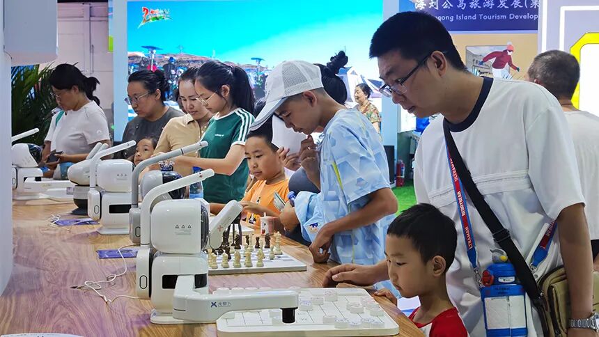 市民体验与智能机器人下棋。人民网记者 张雪冬摄