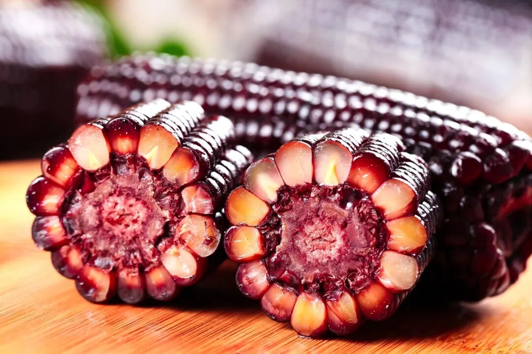 黄玉米中胡萝卜素含量更丰富,紫玉米中花青素含量更高。秘鲁紫玉米中花青素含量为1640mg/100g,而鲜蓝莓花青素含量只有其1/4左右,中国紫玉米籽粒中花青素总量为42~354mg/100g,个别品种紫玉米芯中的花青素可达到462mg/100g。