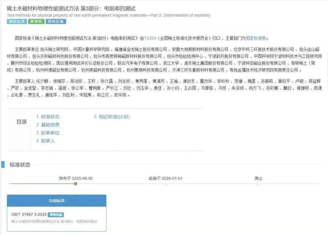 近日,全国稀土标准化技术委、国家标准委正式发布了推荐性国家标准GB/T 31967.3-2025《稀土永磁材料物理性能测试方法 第3部分:电阻率的测试》,该标准由包头稀土研究院、中国计量科学研究院牵头起草,将于2026年1月实施。