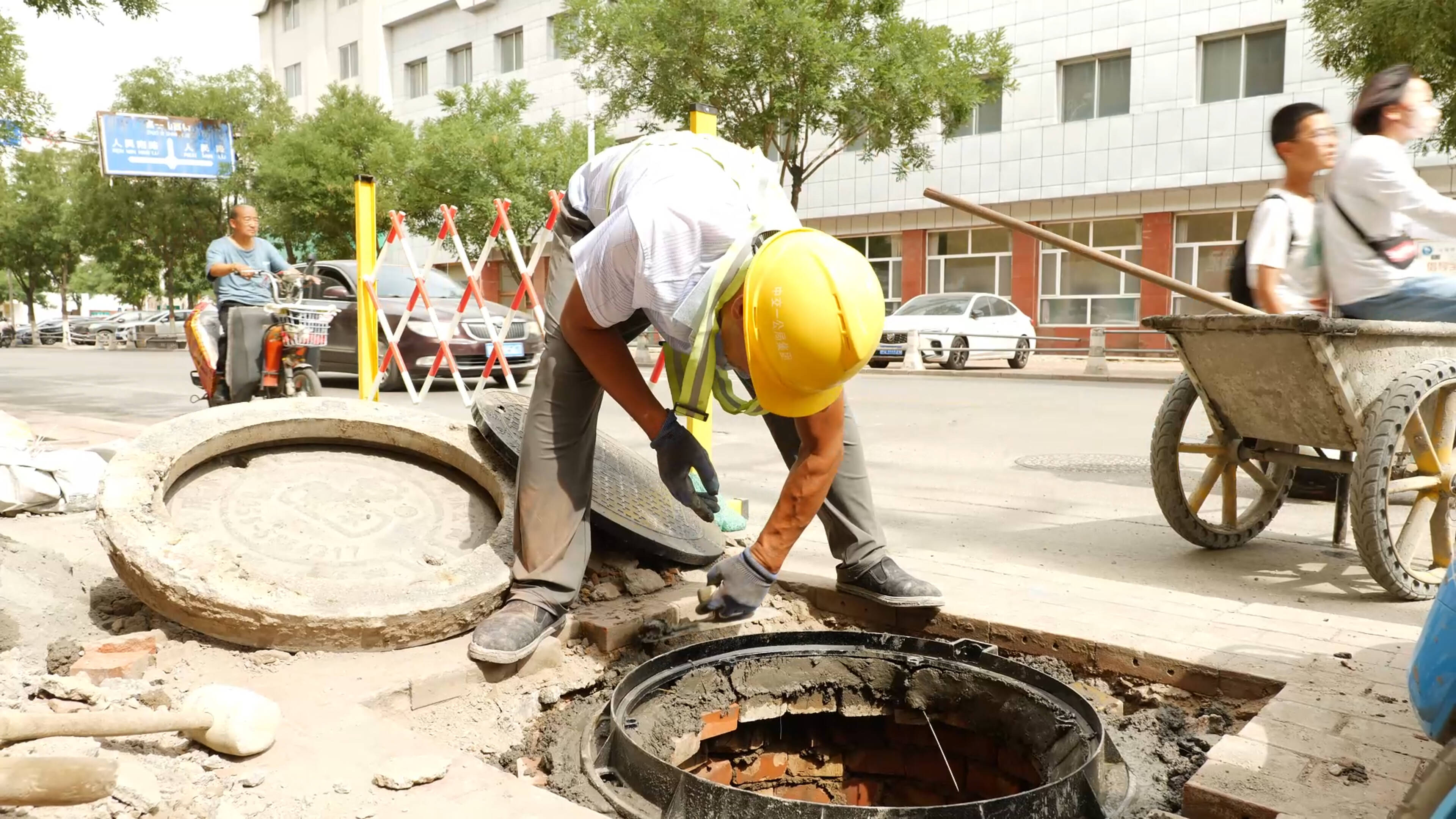 清晨的海勃湾区人民路与桌子山东街交会处,施工人员正俯身更换沿街破损的井盖。看似寻常的修缮却是海勃湾区人行道维修工程的缩影,藏着对市民出行安全的细微牵挂。“以前门口道路周围,好多井盖都陈旧破损了,来来往往的不美观、更不安全。现在换了新的,好看又舒心。”市民张建宽望着平整的路面,笑意写在脸上。