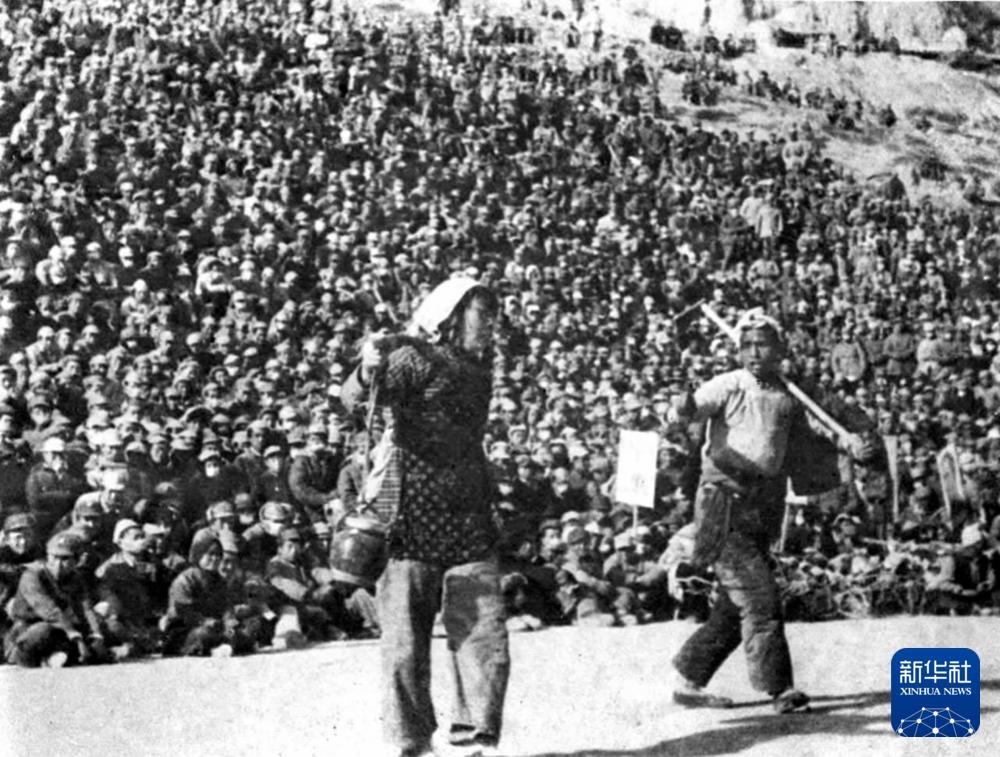 延安鲁迅文艺学院王大化、李波在广场为群众演出秧歌剧《兄妹开荒》。吴印咸摄