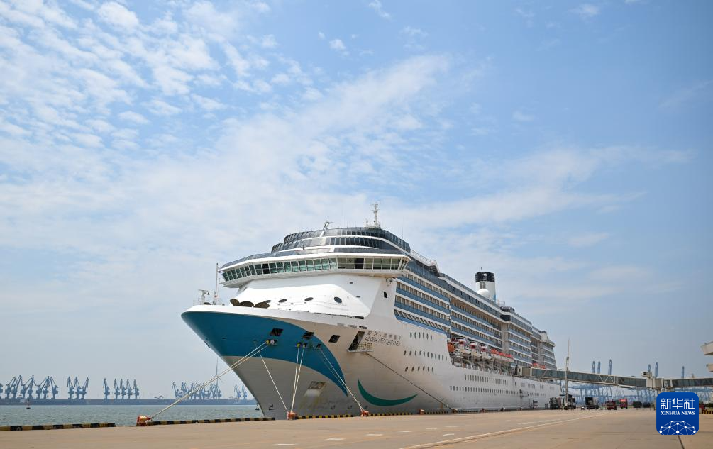 这是7月23日拍摄的靠泊在天津国际邮轮母港的“爱达·地中海”号国际邮轮。当日,“爱达·地中海”号国际邮轮搭载着约1600名旅客缓缓靠泊天津国际邮轮母港,随后搭载1500余名旅客离港驶向韩国济州、日本佐世保,开启六天五晚的邮轮游。
