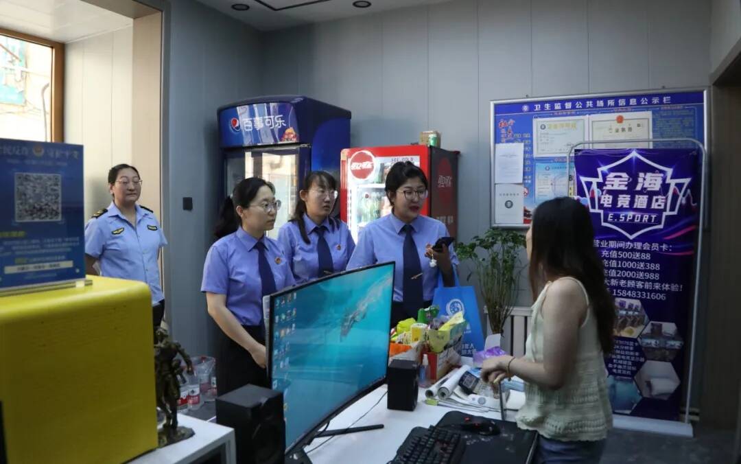 执法人员组成“检察+公安+市监”联合突击队,以“四不两直”方式,突击检查宾馆、电竞网吧、KTV包厢等场所。