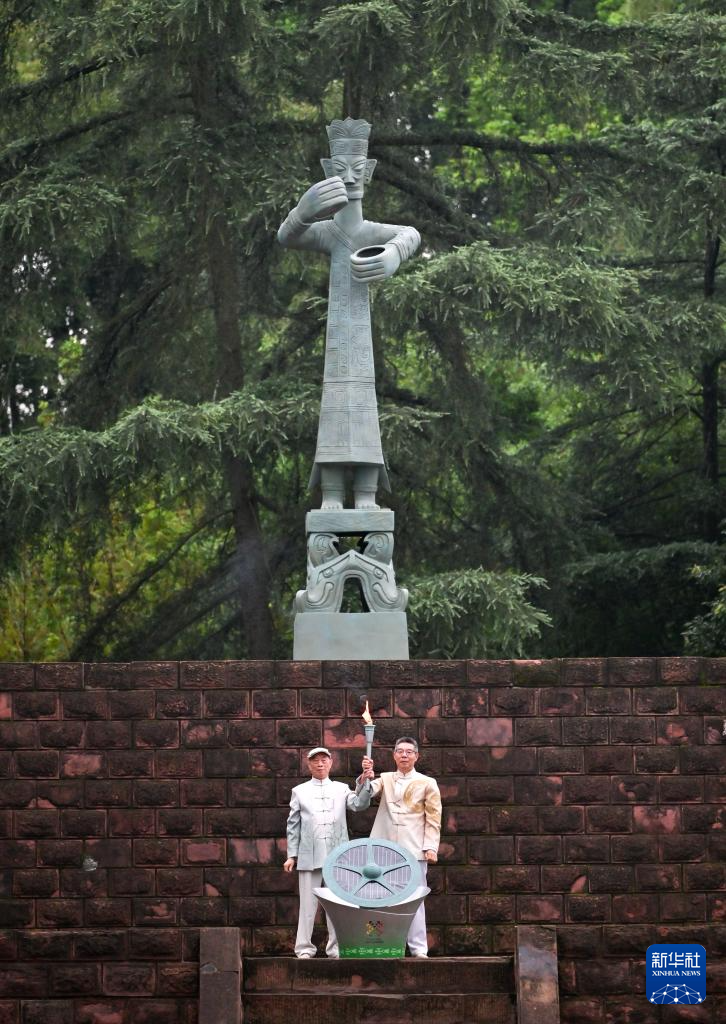 7月26日,三星堆博物馆代表肖先进(左)、金沙遗址博物馆代表朱章义在火种采集仪式上展示火种。新华社记者 刘坤 摄
