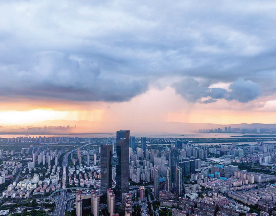 7月27日傍晚,南京长江上空上演了一场震撼的“雨带穿江”气象奇观。无人机航拍画面显示,宽约数公里的雨幕如白色纱帐,自长江向江北方向缓缓推进,好似一幅流动的水墨画。(宋峤)