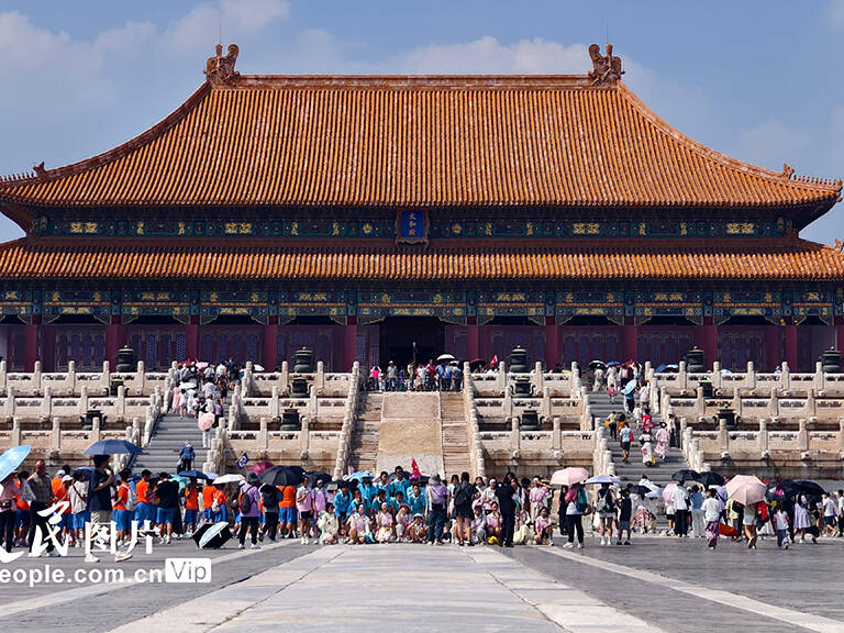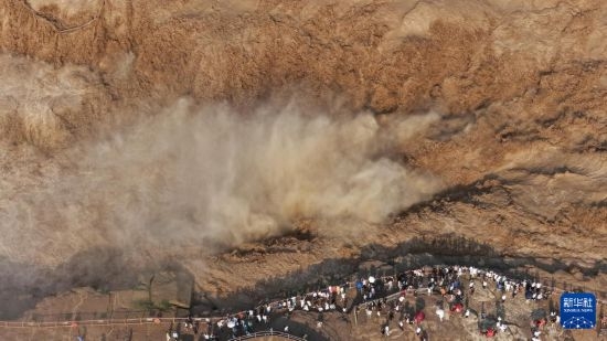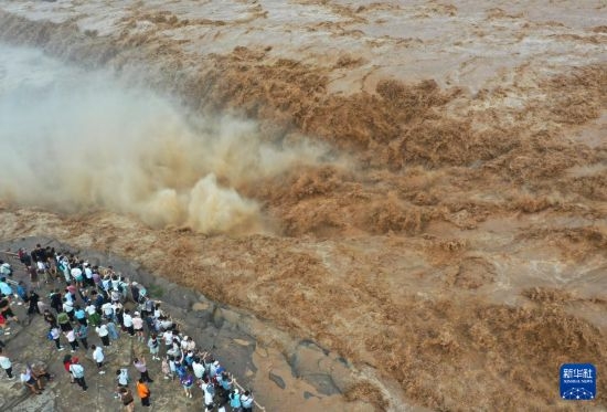 7月27日,人们在山西吉县观看黄河壶口瀑布(无人机照片)。新华社发(刘宏达摄)