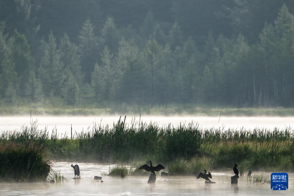 盛夏清晨,位于内蒙古兴安盟阿尔山市的乌苏浪子湖晨雾弥漫,飞鸟翔集,绘就一幅美丽的生态画卷。(马金瑞)