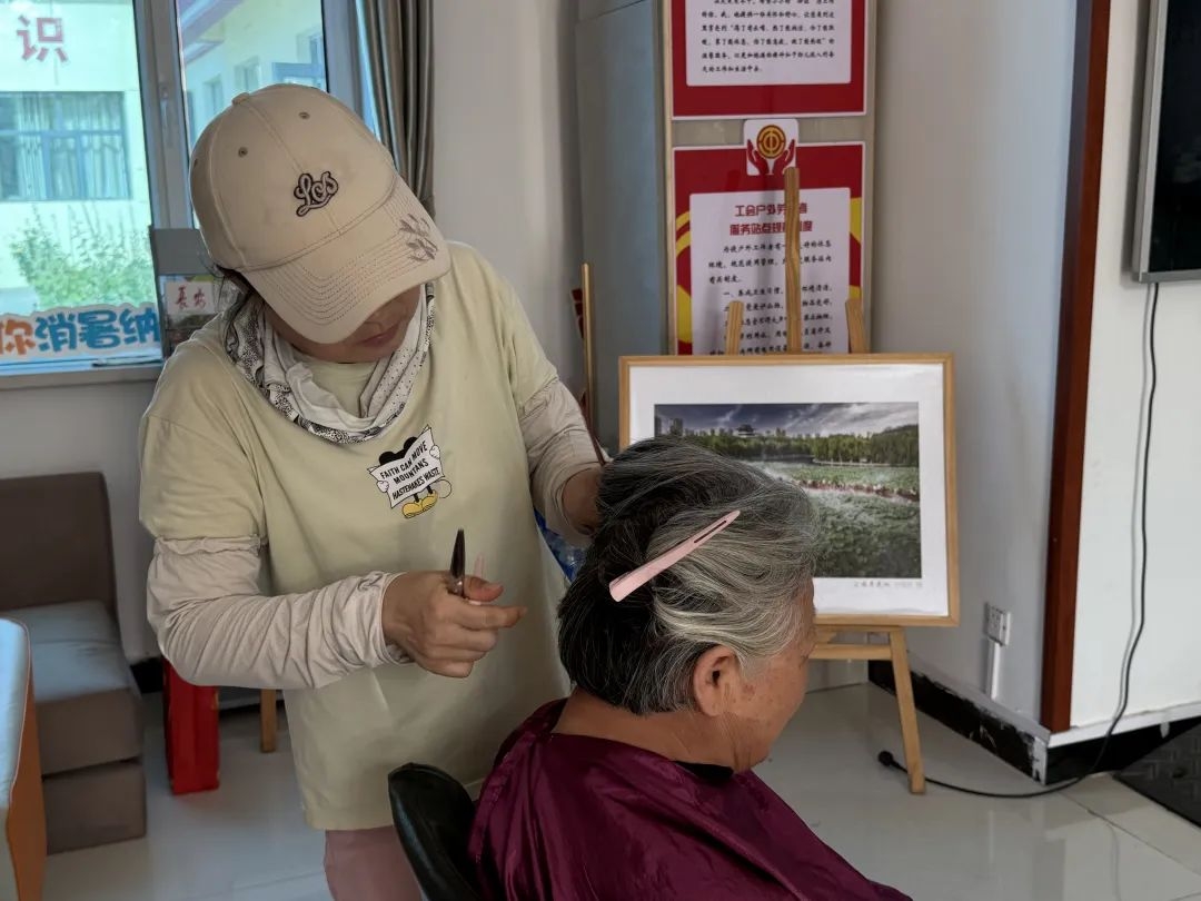 在海勃湾区海北街道工会驿站,志愿者为4位户外劳动者修剪了发型,街道工作人员还给28位户外劳动者们发放了清凉物资,叮嘱他们继续发挥新业态群体及户外劳动者活动区域广、接触人群多、信息渠道畅、传播范围广等优势,充分发挥平安先锋哨作用。