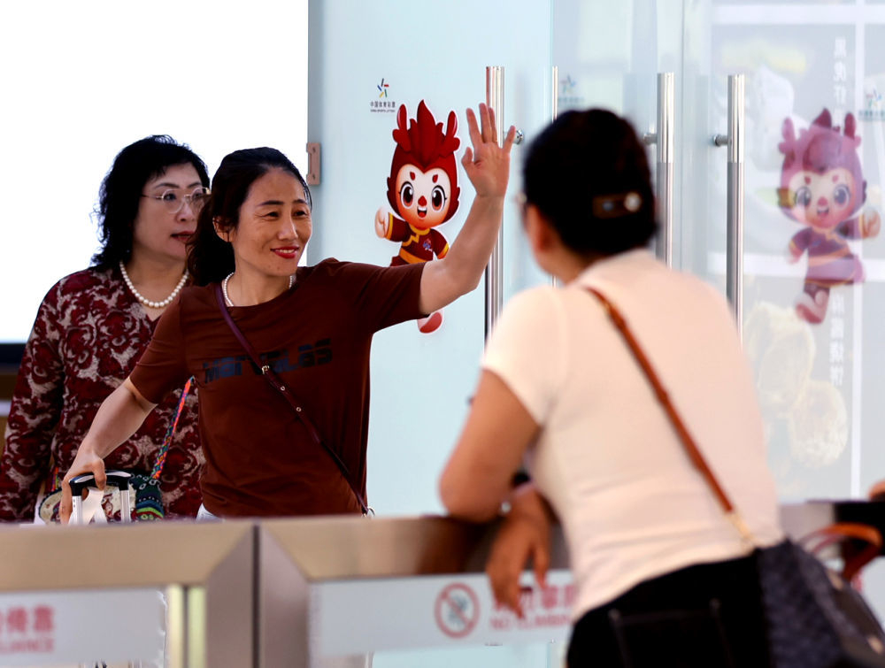 7月25日,旅客经过贴着赛会吉祥物图案的赤峰机场出口处。新华社发(曹政 摄)
