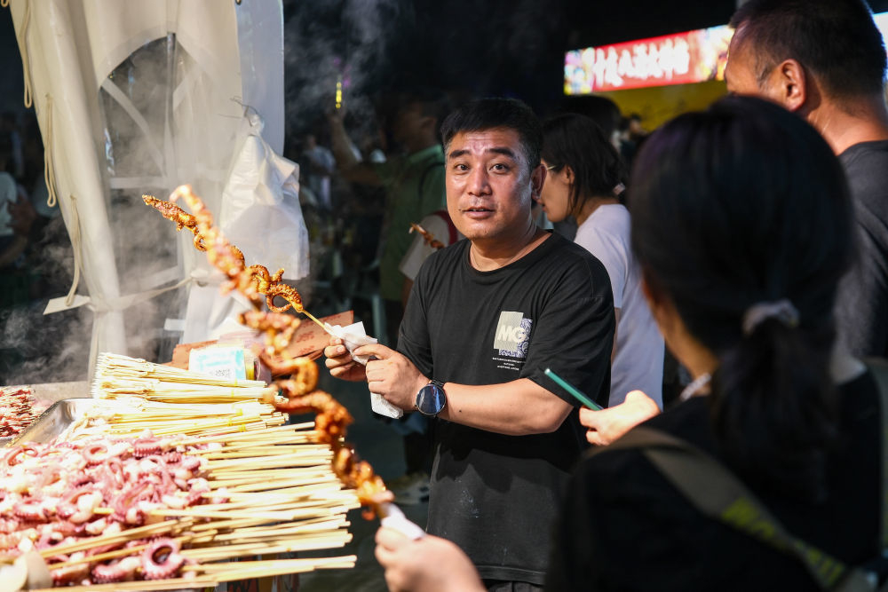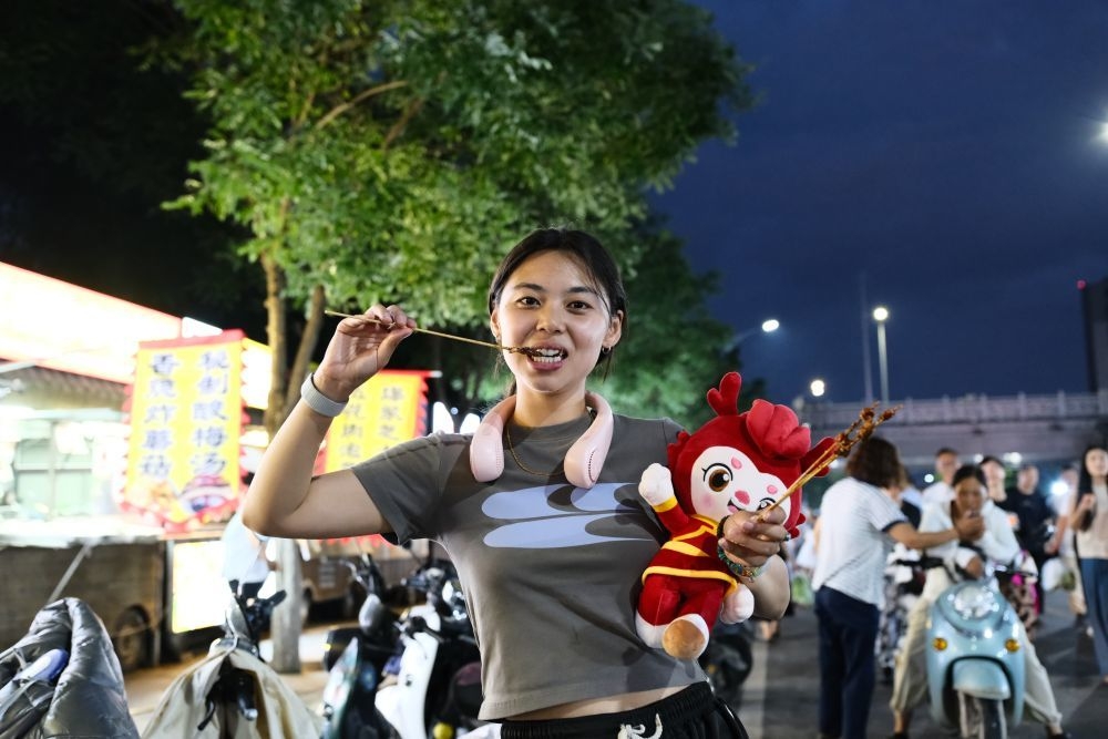 7月25日,在内蒙古赤峰市,抱着赛事吉祥物玩偶的游客在夜市品尝美食。 新华社记者 马金瑞 摄