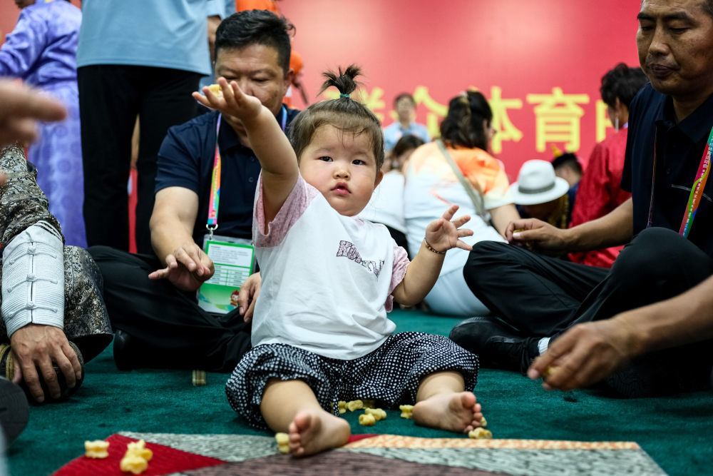 7月29日,在内蒙古赤峰市赤峰体育中心,小朋友在体验投掷沙嘎。 新华社记者 马金瑞 摄