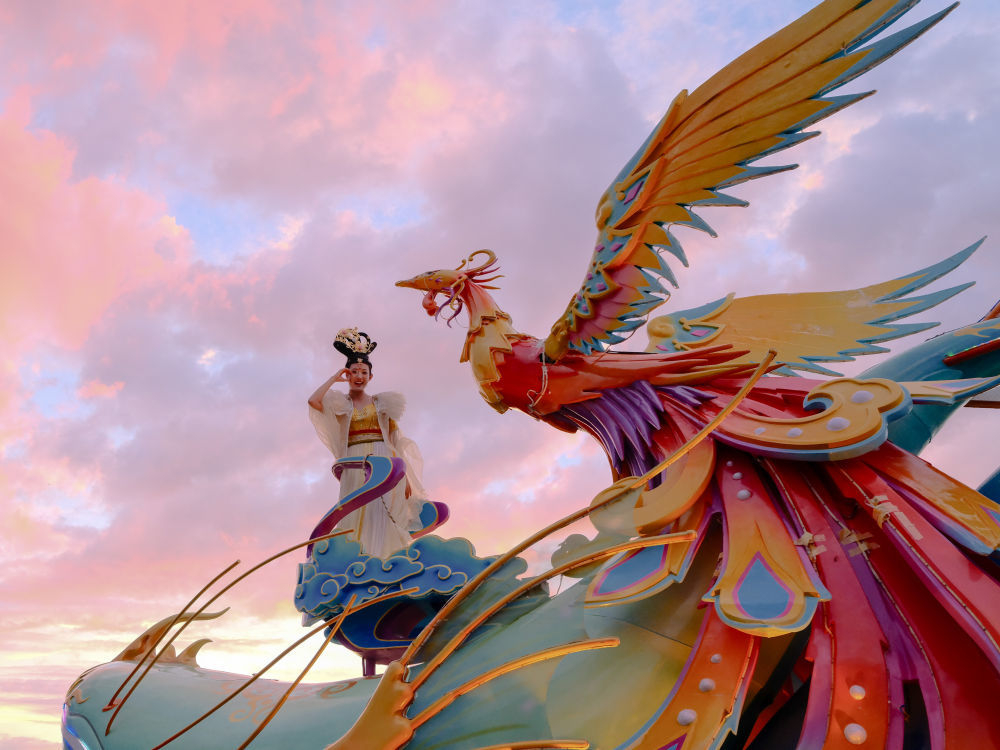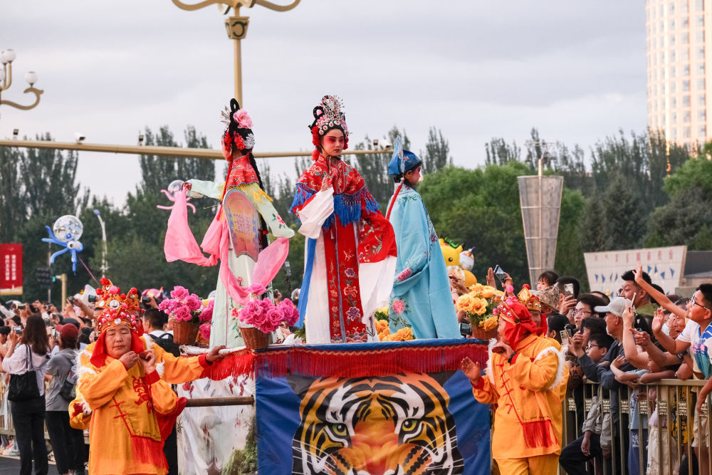 7月29日,在内蒙古赤峰市,内蒙古自治区非物质文化遗产抬阁花车与游客互动。 新华社记者 马金瑞 摄