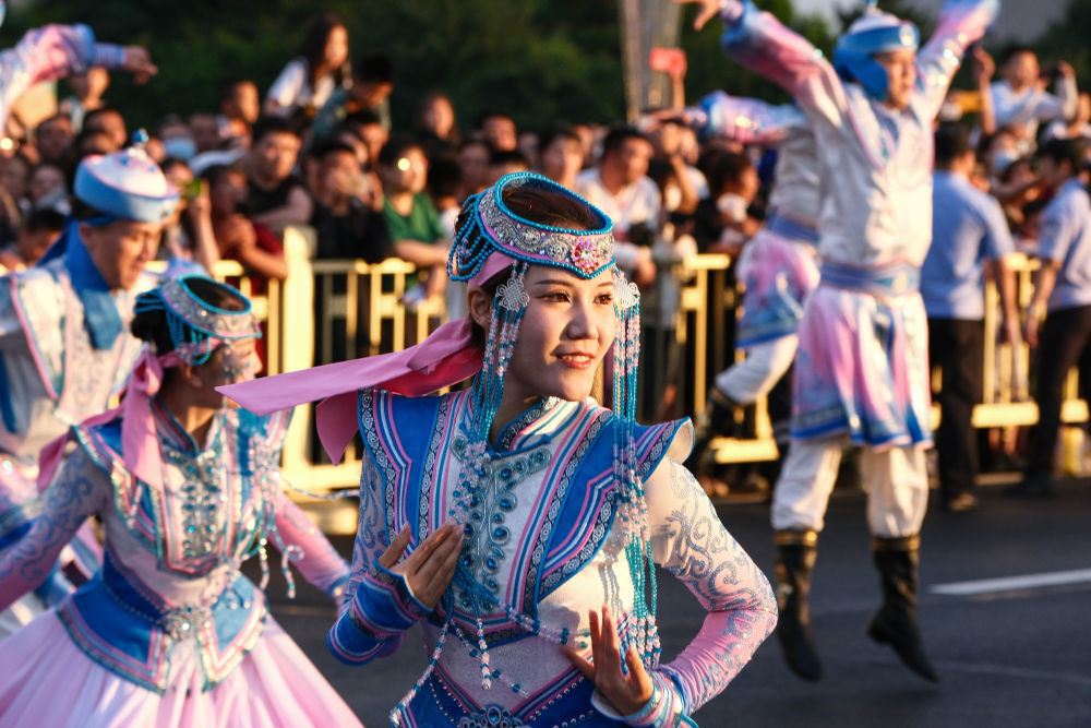 7月29日,在内蒙古赤峰市,演员在花车巡游中表演民族舞蹈。新华社记者 马金瑞 摄