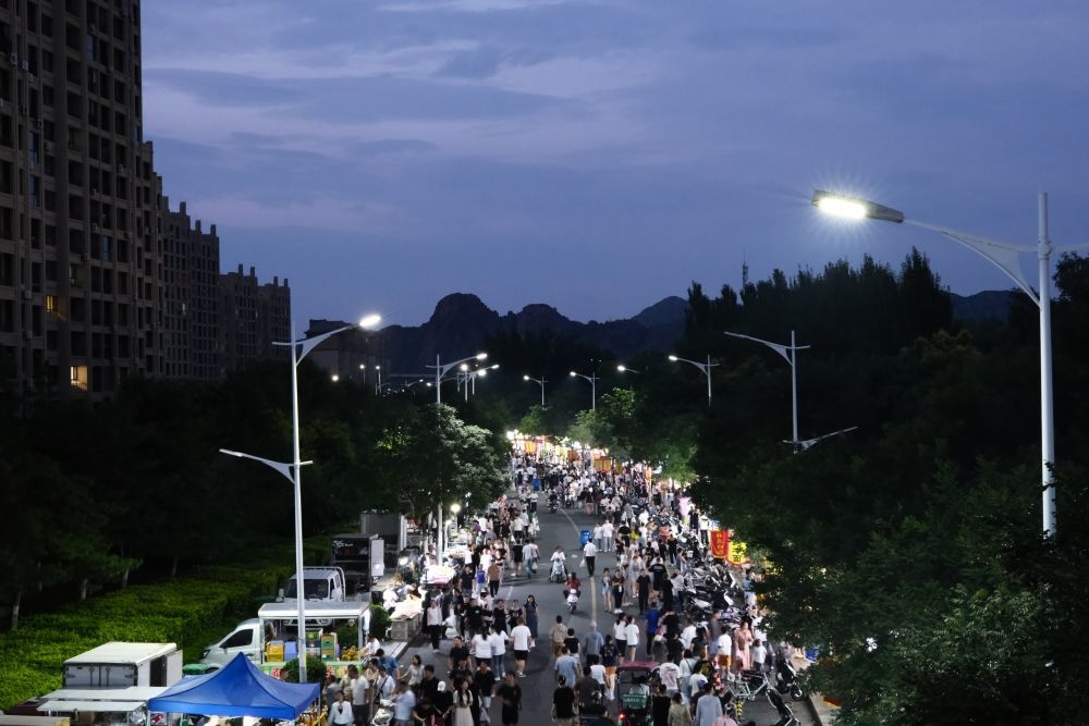 7月25日,在内蒙古赤峰市,游客们在红山前的夜市上休闲游览。 新华社记者 马金瑞 摄