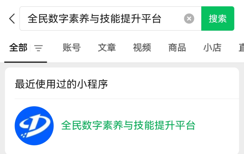 2.打开微信APP,在搜索栏输入“全民数字素养与技能提升平台”,点击进入小程序。