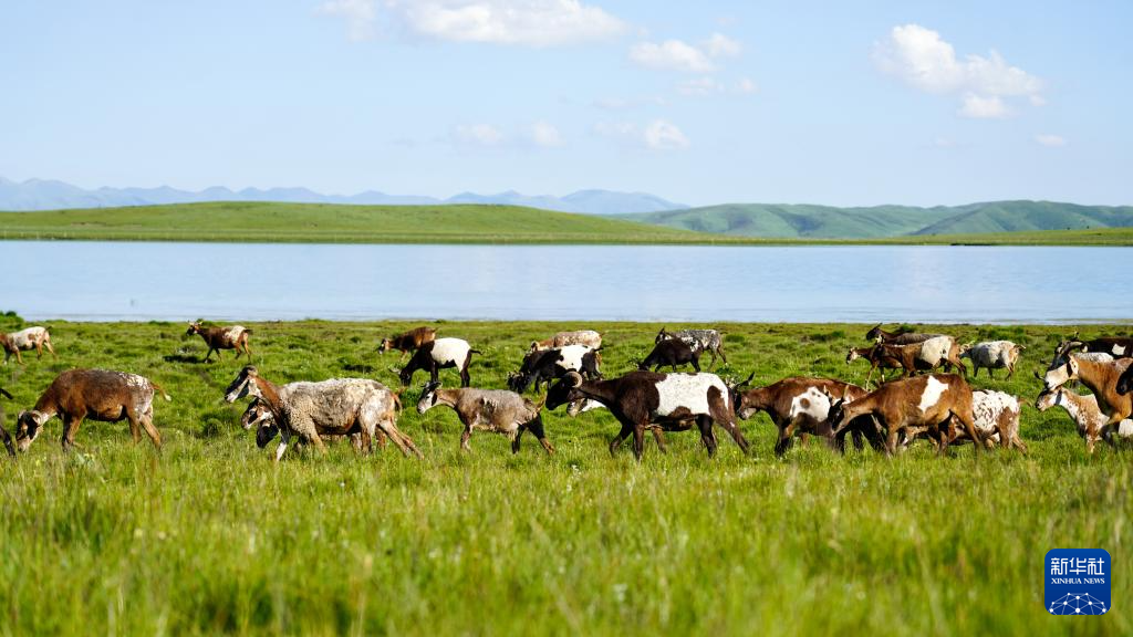 夏日,青海省黄南藏族自治州泽库县境内水草丰饶,草原、蓝天、牛羊构成别致的美景。泽库县平均海拔3700米,2022年入选全国草原畜牧业转型升级试点县。(王艳)