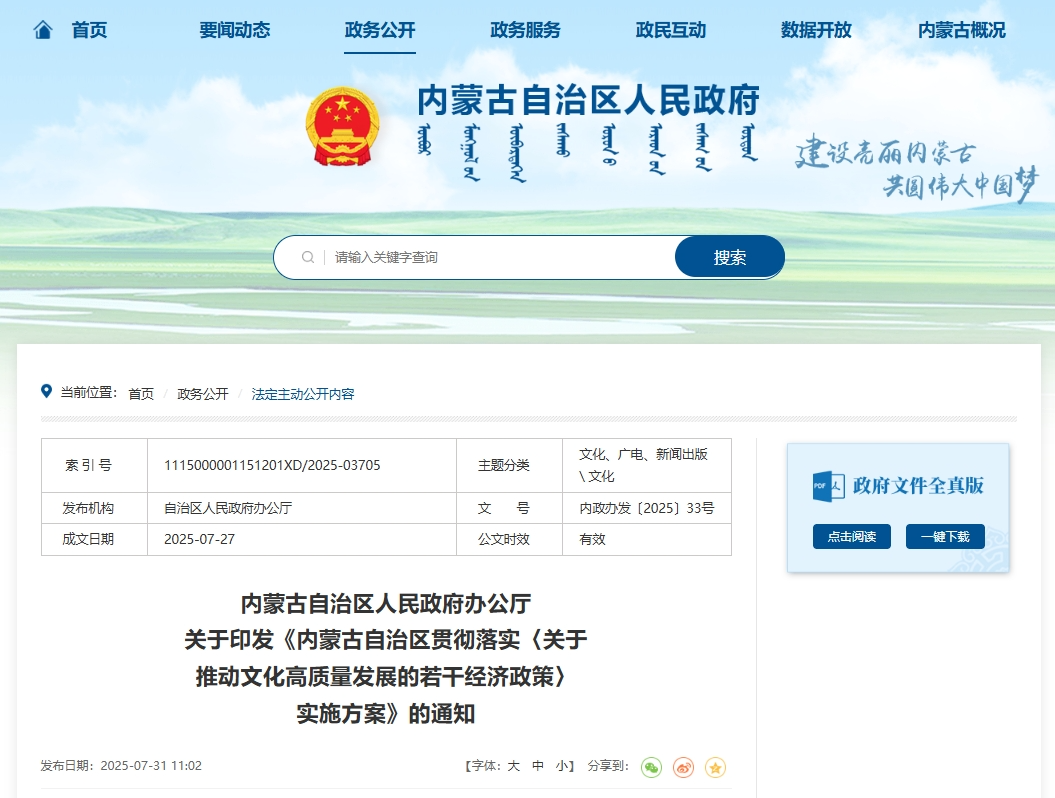内蒙古自治区人民政府办公厅关于印发《内蒙古自治区贯彻落实〈关于推动文化高质量发展的若干经济政策〉实施方案》的通知