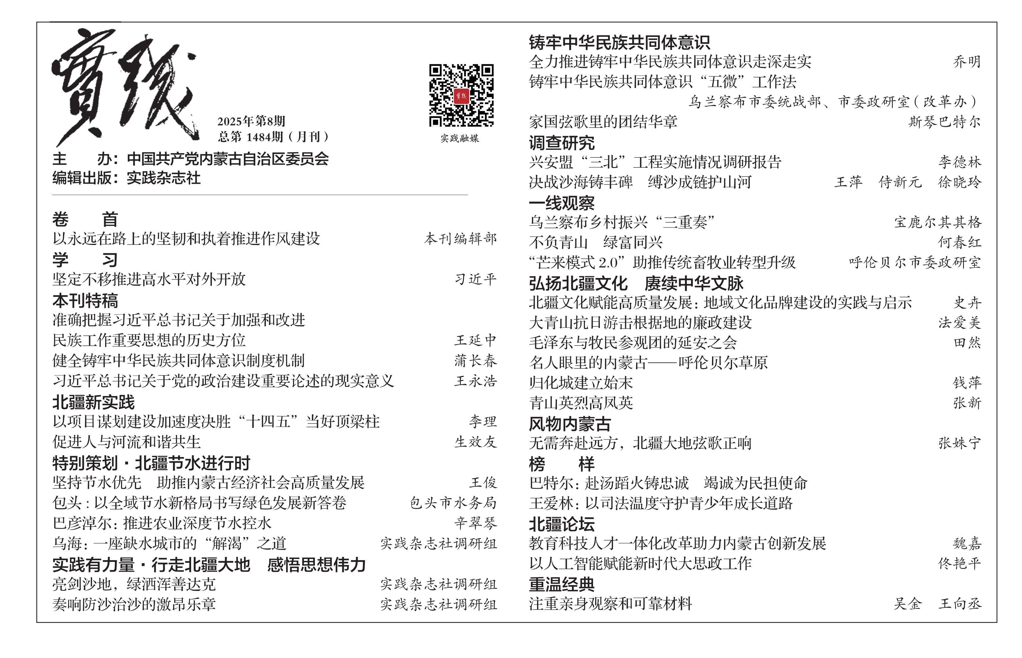 点击文章题目,阅读本期精彩内容! 卷 首 本刊编辑部 学 习 习近平 本刊特稿 14 准确把握习近平总书记关于加强和改进民族工作重要思想的历史方位 王延中 蒲长春 王永浩 北疆新实践 李理 生效友 特别策划·北疆节水进行时 近年来,自治区党委、政府深入贯彻习近平总书记“节水优先、空间均衡、系统治理、两手发力”治水思路,坚决落实“四水四定”原则,将节水行动纳入“六个行动”重大部署,以制度构建为基、以刚性约束为纲、以潜力挖掘为要、以活力激发为引,推动水资源节约集约利用迈出坚实步伐。本期“特别策划”,系统展现自治区在节水行动中的探索与成效,呈现北疆大地在水资源可持续利用中书写的发展新篇章。 王俊 包头市水务局 辛翠琴 实践杂志社调研组 实践有力量·行走北疆大地 感悟思想伟力 当前,全区上下正以“慢不得”的紧迫感和“坐不住”的责任感,加快落实习近平总书记交给内蒙古的“五大任务”,努力在“贯穿一条主线、办好两件大事、弘扬蒙古马精神、闯新路进中游”上取得更大进展。北疆大地高质量发展动能澎湃,转型发展势头强劲。实践杂志社策划开展“行走北疆大地 感悟思想伟力”主题调研活动,组织编辑记者深入十二盟市,聚焦各地深化落实“五大任务”的生动实践,本栏目陆续推出多维度、立体化深度报道,敬请关注。 实践杂志社调研组 实践杂志社调研组 铸牢中华民族共同体意识 乔明 乌兰察布市委统战部、市委政研室(改革办) 斯琴巴特尔 调查研究 李德林 王萍 侍新元 徐晓玲 一线观察 宝鹿尔其其格 何春红 呼伦贝尔市委政研室 弘扬北疆文化 赓续中华文脉 史卉 法爱美 田然 钱萍 张新 风物内蒙古 张姝宁 榜 样 北疆论坛 魏嘉 佟艳平 重温经典 重温经典,固本培元;品读名篇,致知力行。本刊开设“重温经典”栏目,推出摘编自《重温经典学调研》一书的文章《注重亲身观察和可靠材料——读恩格斯的〈英国工人阶级状况〉》。恩格斯深入社会实际的调研实践与严谨方法,至今闪耀着真理光芒。重温此篇,邀读者感悟经典著作历久弥新的思想伟力。 77 注重亲身观察和可靠材料——读恩格斯的《英国工人阶级状况》 吴金 王向丞