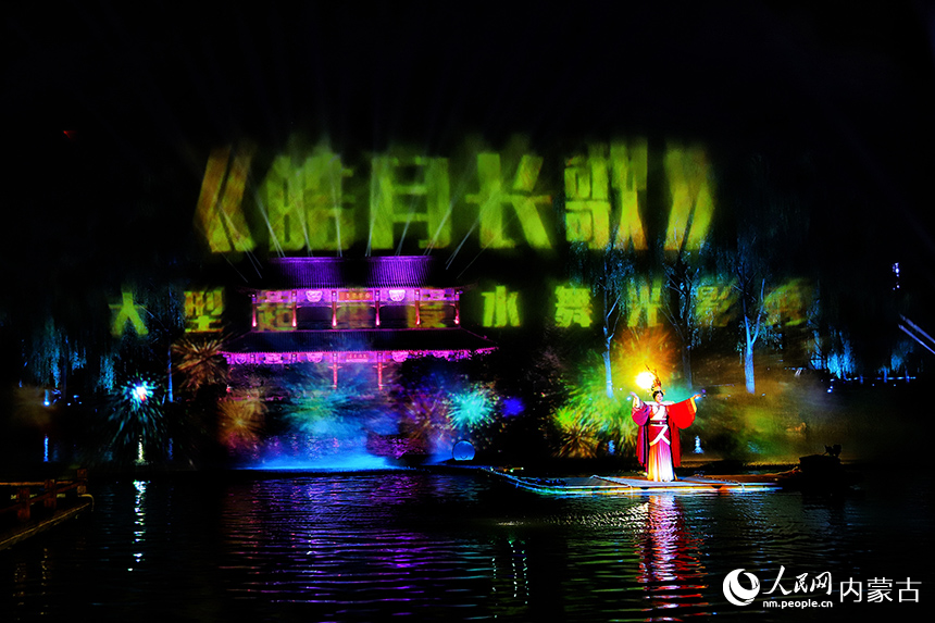 8月1日晚,大型音乐水舞光影秀、水上户外沉浸式实景演出《皓月长空》在呼和浩特赛罕区丝绸之路公园上演。