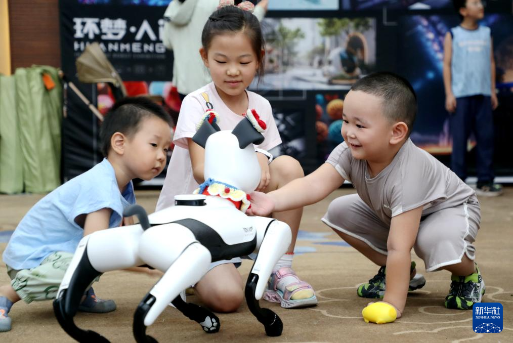 8月3日,山东省东营市的小朋友在AI智能机器人科普展上与智能机器人互动。新华社发(刘智峰 摄)