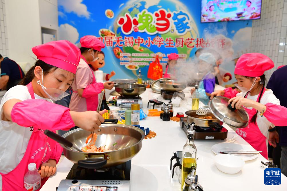 8月3日,小朋友在第四届无锡中小学生厨艺挑战赛初赛现场比拼。新华社发(还月亮 摄)