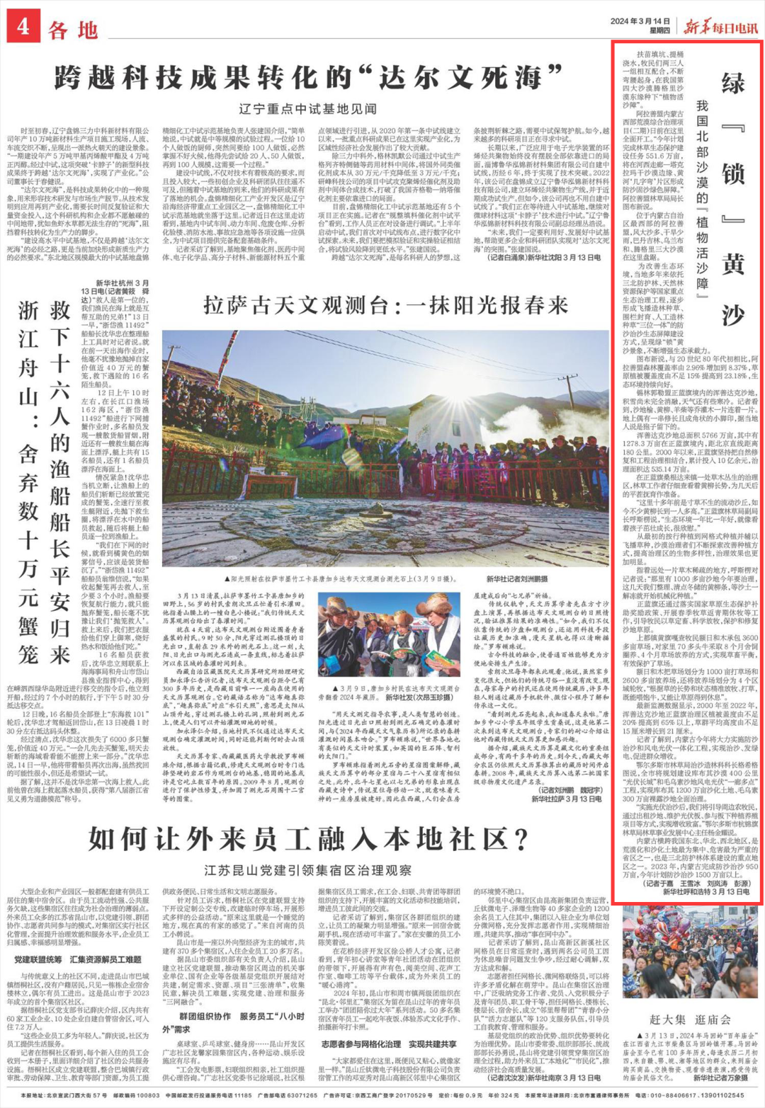 2024年3月14日,《新华每日电讯》第4版刊发题为《绿“锁”黄沙 我国北部沙漠的“植物活沙障”》的新闻,报道如下: