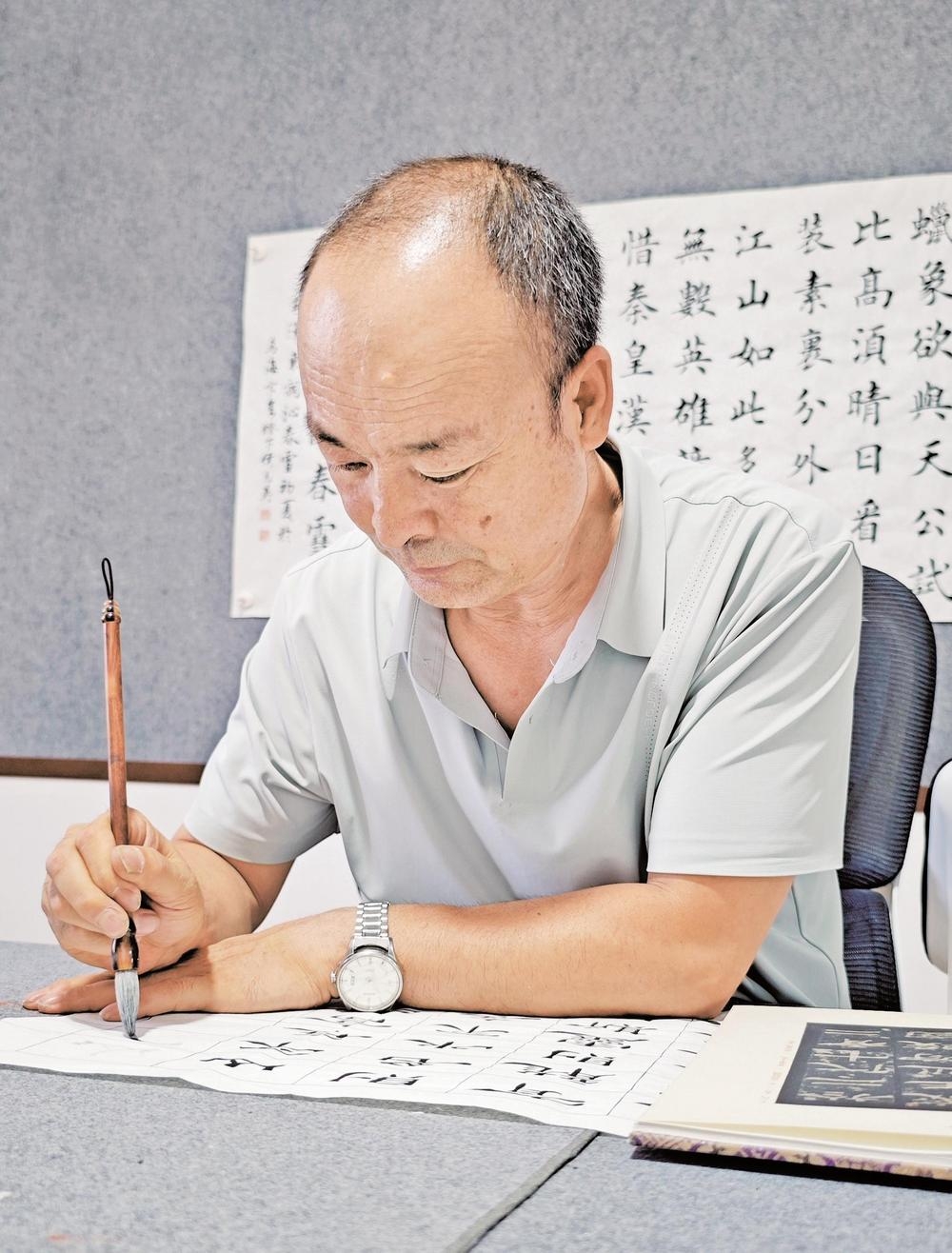 在侯志英看来,书法练习中楷书是基础,“没楷书底子,写草书就容易飘,站不住脚,就不会有力透纸背的感觉。”他觉得练习书法是修身养性的好方法,他说:“练字不光能练性子,让人沉下来不毛躁,还能学到很多知识。因为写字的时候得琢磨内容的背景、情感,这本身就是在学习历史文化知识。”